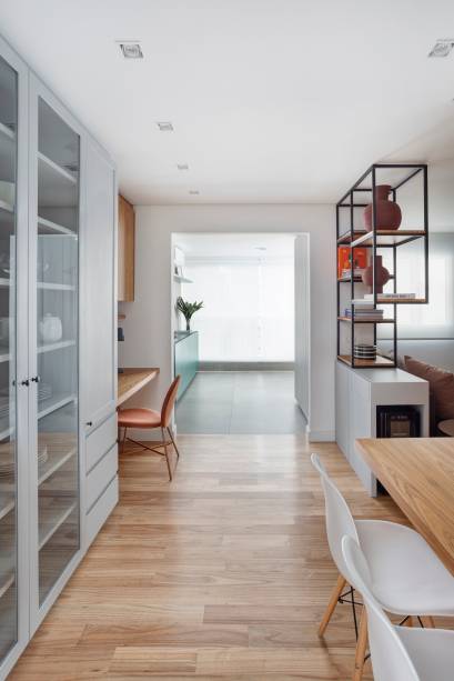 A cozinha tem bancada de Corian e a sala ganhou home office e um móvel que funciona como cristaleira