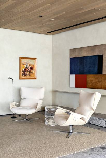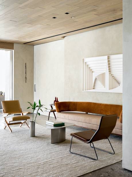 Ao entrar no apartamento, é possível sentir a atmosfera acolhedora que os arquitetos planejaram. Um delicado forro de carvalho europeu tingido emoldura os ambientes e cria este clima.