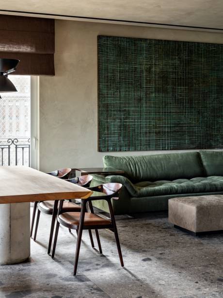 Assinado pelo escritório Meireles + Pavan Arquitetura, este apartamento, em São Paulo, tem como base ambientes revestidos de materiais rústicos e exclusivos para criar uma atmosfera confortável e contemporânea. Logo no hall de entrada, o mármore ceppo di gre, usado pela primeiro vez no Brasil neste projeto, envelopou o espaço para receber os visitantes.