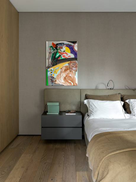 Todo o mobiliário foi cuidadosamente personalizado com tecidos e acabamentos escolhidos a dedo pelos moradores. Assim, foi possível criar um interessante jogo de texturas e intensificar o clima aconchegante, que estava no briefing do projeto. As pinturas das paredes, que brincam com o claro e o escuro, também foram pensadas para isso.