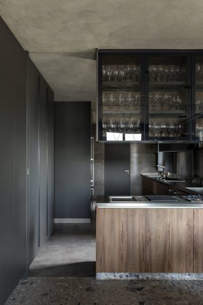 Com tons escuros e elegantes, a cozinha foi projetada para exercer as funções do dia a dia como também para receber os amigos para um eventual encontro gourmet. Assim, ela foi aberta para a sala de jantar e ganhou uma poderosa coifa, que também ajuda a setorizar o ambiente.