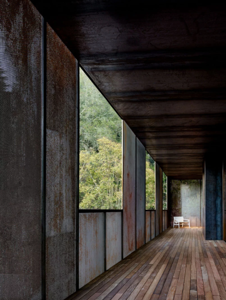 Um mezanino interior tem vista para o espaço familiar de altura dupla. O exterior, por sua vez, é envolto por painéis de chuva de aço corten, enquanto os interiores recebem acabamentos de madeira de carvalho inacabada, aproveitando o custo de manutenção anual zero.