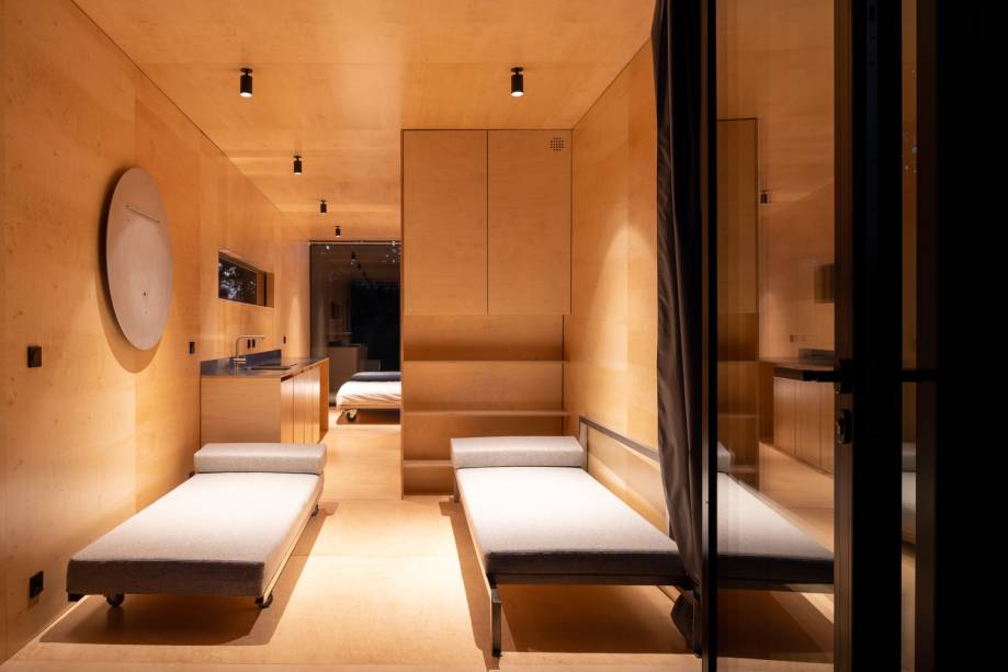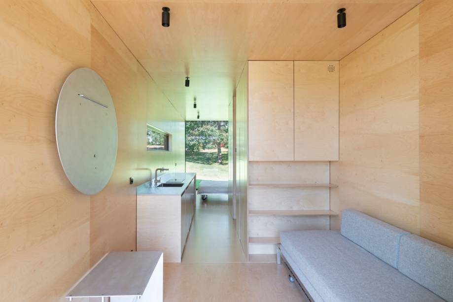 Enquanto isso, todos os componentes internos foram projetados individualmente para a cabine. Dentro da estrutura de metal, encontra-se um acabamento de madeira compensada natural quente. O espaço de 23 m² conta com dois quartos, uma sala, uma cozinha e um banheiro. Esta função extensa foi possibilitada por móveis transformáveis. Já a porta de vidro, é dobrável e abre em toda a largura, e o interior se expande para um terraço ao ar livre com vista para o lago.