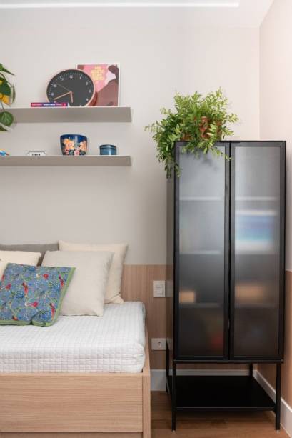 Para as duas suítes foram escolhidos mobiliários soltos, possibilitando maior flexibilidade dos espaços. Um pedido importante dos clientes, era ter espaço para guardar seus livros. Para atender essa necessidade, foram criadas várias prateleiras e uma peça fechada de serralheria e vidro, fugindo do convencional da marcenaria.
