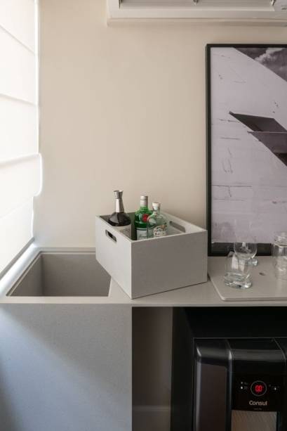 “O banco em ‘L’ no canto do apartamento foi feito de corian, material que possibilita variáveis formas e desenhos. Para essa peça desenvolvemos um banco que parte coladinho no bar em serralheira, une-se com o trecho inclinado e chega até o outro lado, próxima a janela. Para essa peça ser instalada, foi necessário dividi-la em três partes para serem “montadas in loco”. Esse material possibilita a junção completa das partes sem deixar emendas visíveis. O bar próximo à janela conta com um balde removível feito do mesmo material”, explicam os arquitetos.