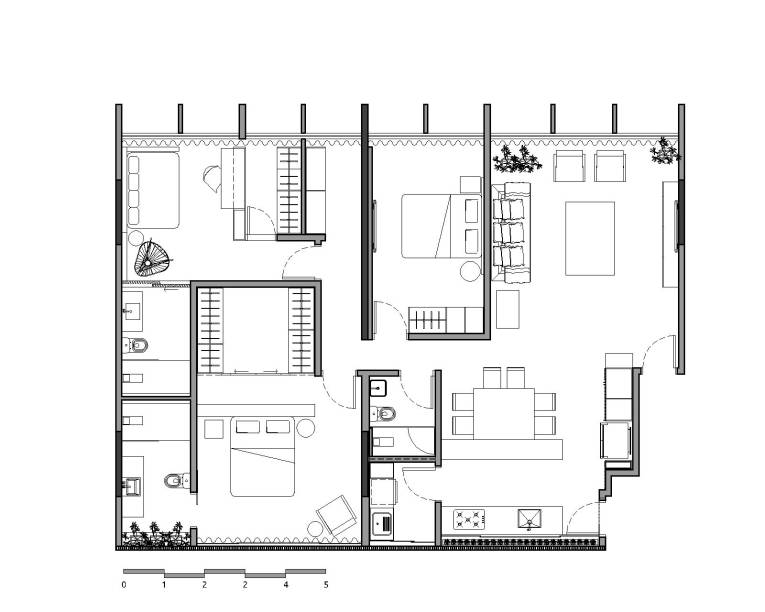 Originalmente contendo apenas uma suíte, os cômodos de serviço e cozinha do apartamento foram ressignificados para que fosse possível a criação da segunda suíte. O cobogó, elemento da fachada do prédio e que aparecia exclusivamente na área de serviço, passou a ser protagonista na nova suíte, que a tornou a principal do apê.