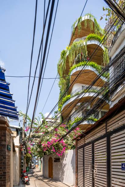 Exuberantes plantas tropicais caem das varandas onduladas desse edifício, criando uma fachada verde que oferece ar fresco e uma atmosfera relaxante. O grande vazio no terreno de 320 m² apresenta uma piscina curva onde os visitantes podem mergulhar em um ambiente tranquilo.