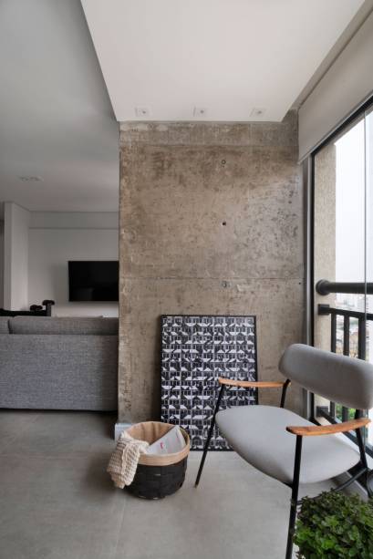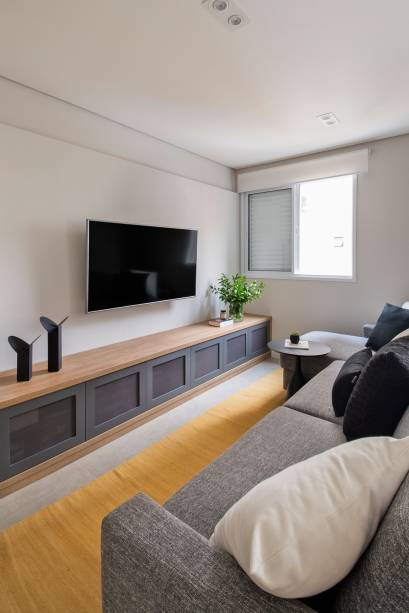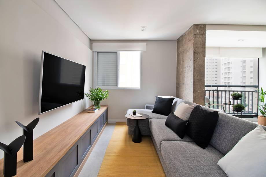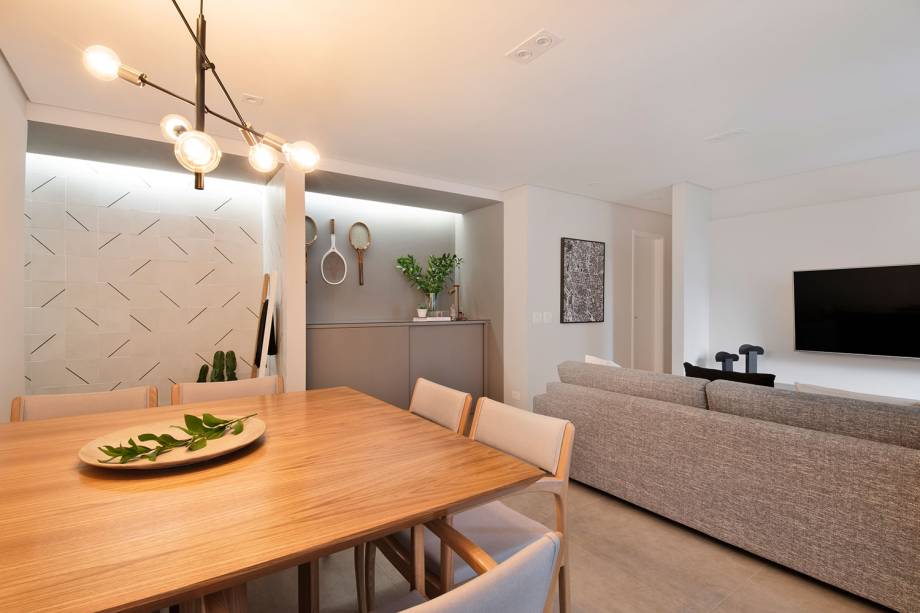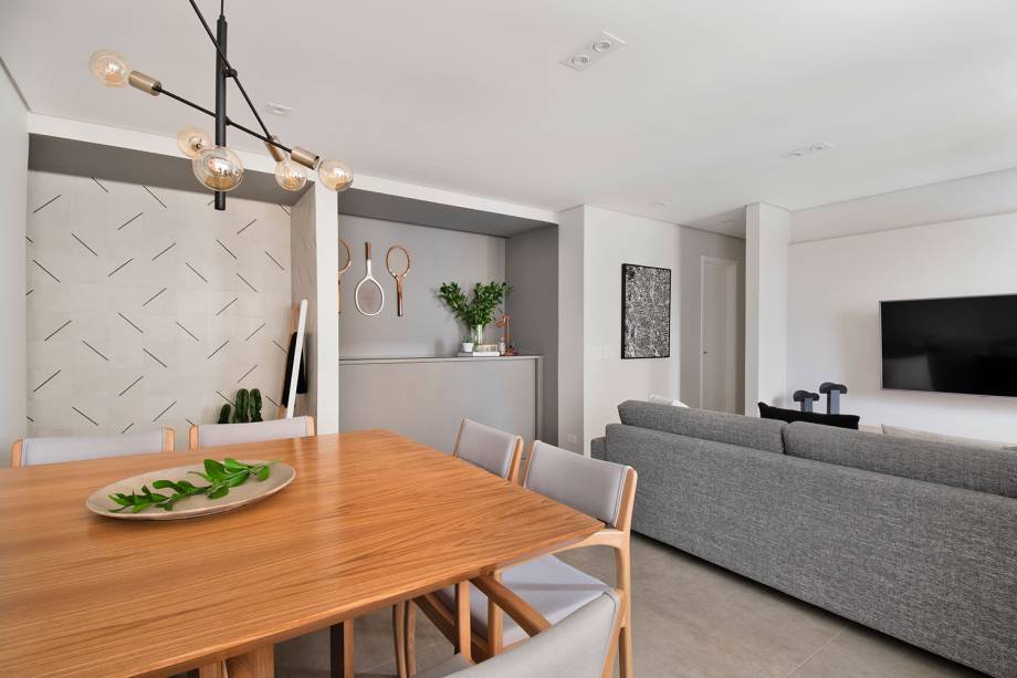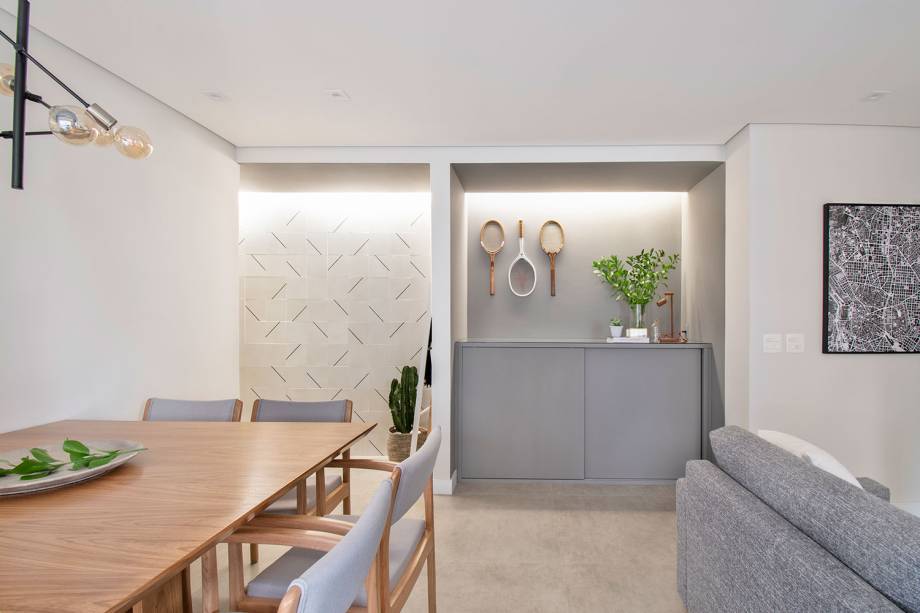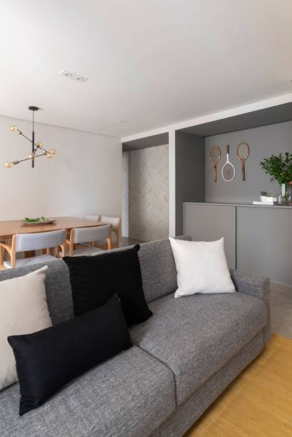 Apê elegante em tons de cinza tem painel de muxarabi iluminado com tela tensionada