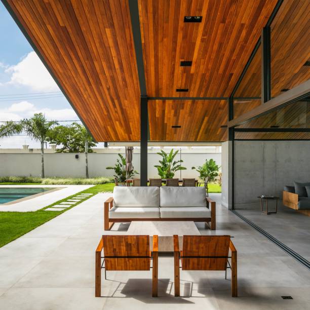 Para Casa CR, como foi chamada, os arquitetos optaram pelo uso de revestimentos do Grupo Indusparquet, como no teto, no lambri e no deque da piscina.