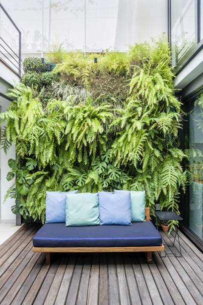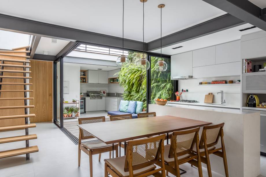 Ainda no pátio, um muro verde vertical foi criado, trazendo a natureza para dentro da casa. Enquanto isso, uma passarela de vidro instalada no piso superior oferece uma oportunidade para a admiração do painel no térreo e no primeiro andar.