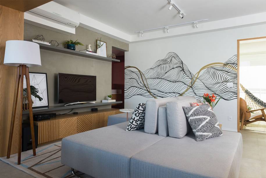 Assim como o sofá, o rack, os armários da cozinha e da varanda também foram desenhados pelas profissionais. A área de destaque, a varanda com rede, foi conectada à sala de estar, mas recebeu um piso diferente – porcelanato padrão madeira com paginação Chevron – o mesmo instalado nos cômodos íntimos.