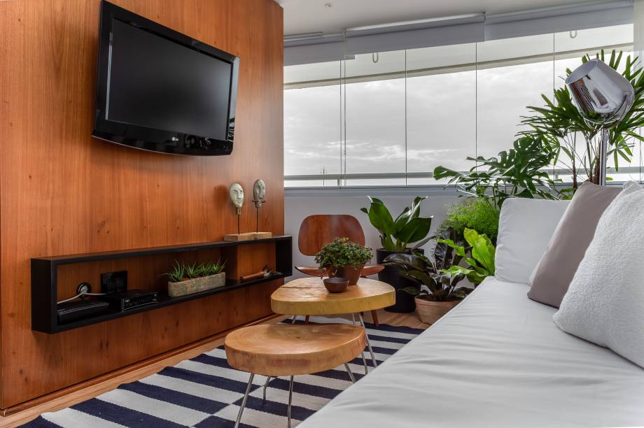 Integração é palavra de ordem em apartamentos pequenos. Mas, neste projeto, a marcenaria planejada elaborada pela arquiteta foi essencial para ao mesmo tempo dividir e incorporar a área gourmet com a sala. Um painel de madeira do lado direito do ambiente abriga TV e esconde parte da cozinha do espaço de convivência. Um piso de madeira único propicia a sensação de amplitude.