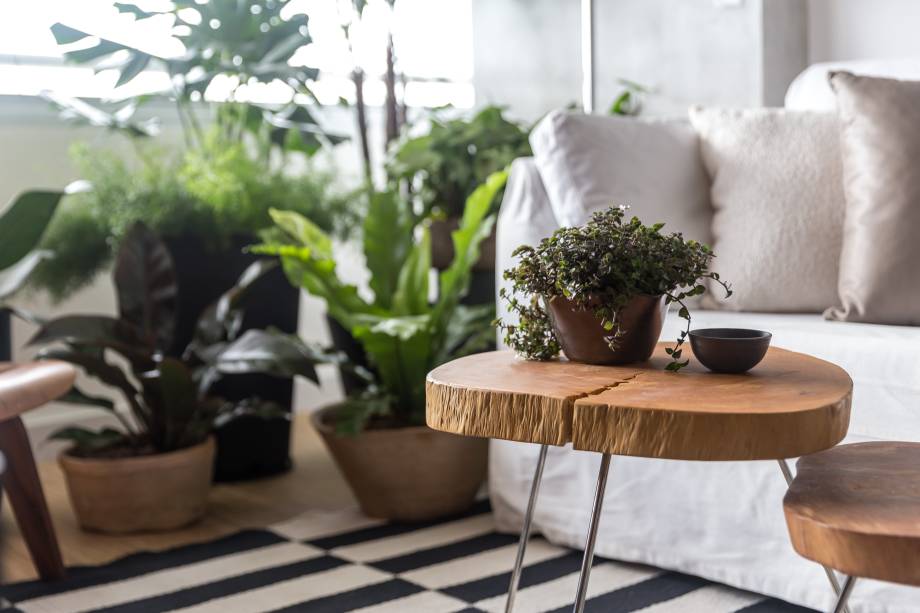 Antes da reforma, a área perto da janela era uma varanda. Para ampliar o espaço, mas continuar mantendo o verde dentro de casa, a arquiteta convidou a paisagista Marianne Ramos para criar os arranjos de plantas. Além de darem vida ao espaço, as folhagens também proporcionam uma sensação de amplitude, afinal quase não se vê a parede onde elas estão, dando a entender que elas se estendem para muito depois do sofá.