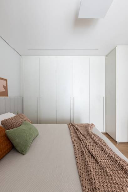 Na suíte da filha, onde o espaço é restrito, uma marcenaria inteligente permitiu a inclusão de uma mesa de home office com espaço de penteadeira e um móvel suspenso ripado. Já na suíte casal, destacam-se a cabeceira estofada em gomos, e armários amplos com acabamentos que conferem leveza.
