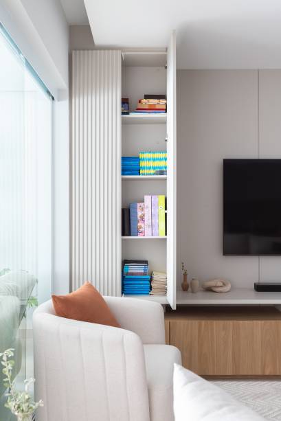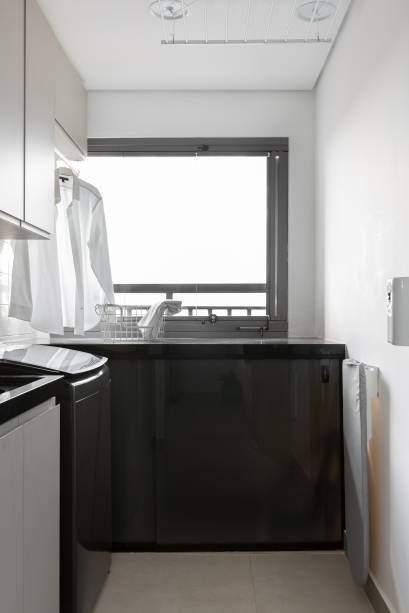 Já na área de serviço, marcenarias sob medida foram aplicadas, garantindo praticidade e organização. Intervenções customizadas, como o móvel ripado que camufla o aquecedor a gás, oferecem uma organização eficiente e uma estética clean.
