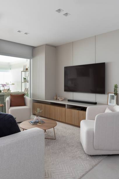 Além disso, a integração da varanda, cozinha e sala de estar foi uma prioridade desde o início do projeto, atendendo aos desejos dos clientes de criar um ambiente fluido. Isso também permitiu uma transição suave entre os cômodos, proporcionando uma sensação de amplitude e facilitando a interação durante as atividades diárias e eventos sociais.