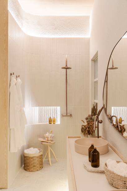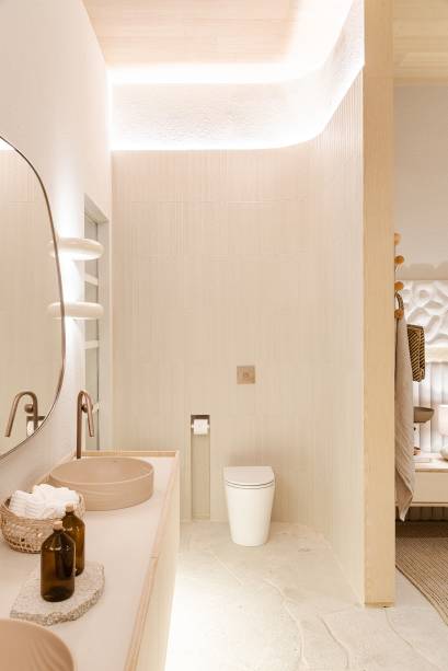 No banheiro, os destaques são o revestimento em plaquetas verticais com luz indireta.