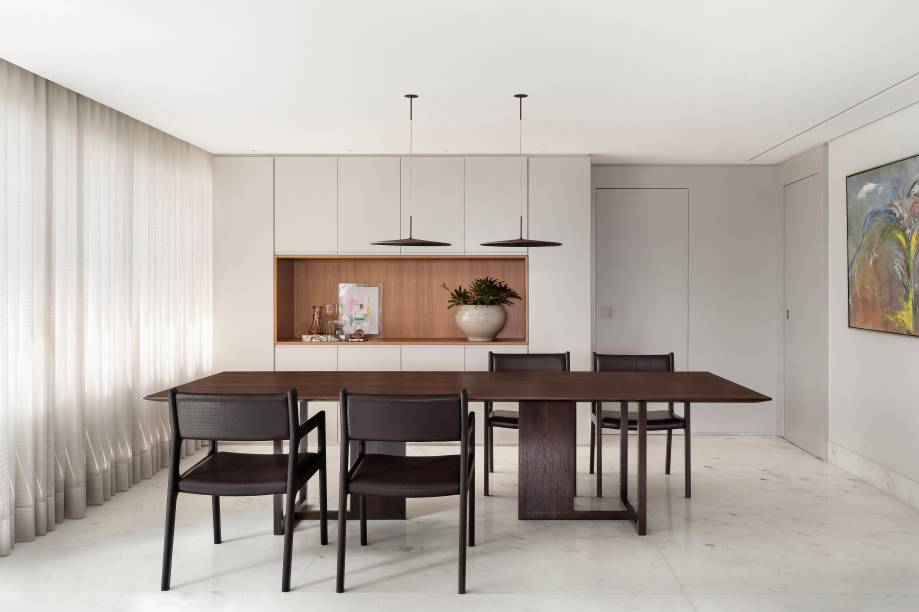 Na decoração, vários móveis que já estavam no apartamento eram atemporais e de boa qualidade e, por isso, foram aproveitados no novo projeto, especialmente na área social, como a mesa e as cadeiras de jantar, a mesa de centro, o sofá (que foi reestofado), a mesa lateral, o extenso banco rústico esculpido em tronco de árvore (agora usado como aparador, atrás do sofá), a mesa da varanda e todas as obras de arte.