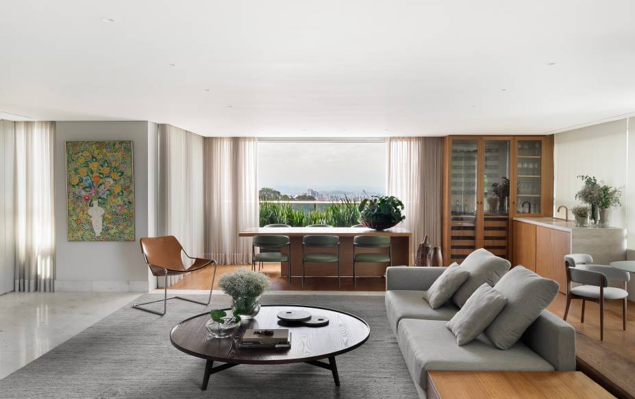 Um casal de idosos já morava neste apartamento de 260 m², em Belo Horizonte, quando decidiu encomendar à arquiteta Camila Medrado um projeto de reforma e decoração. “Basicamente, eles queriam espaços mais amplos, confortáveis e contemporâneos para receber os dois filhos, os cinco netos e os amigos”, conta ela. Com a reforma, o hall de entrada e a varanda foram integrados à área social, criando um espaço de convívio generoso, com 120 m².