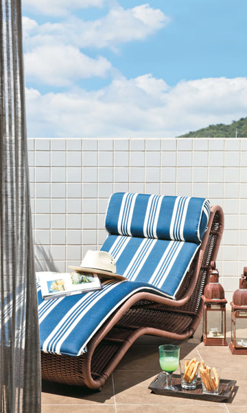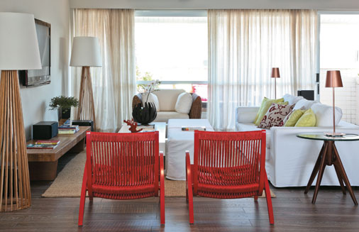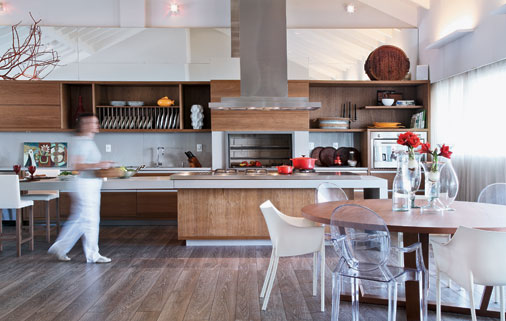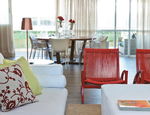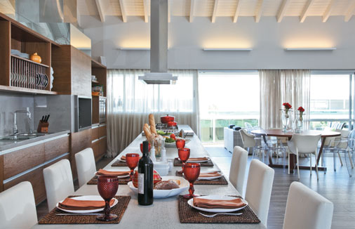 À frente, apenas o mar. O cenário idílico se completa com a alegria da família, um casal e dois filhos adolescentes, em receber amigos. “Fizemos do living um espaço de convivência com churrasqueira, bancada gourmet, mesas de jantar e home theater integrados”, explica Taís Marchetti Bonnetti, sócia do escritório Marchetti+Bonetti. O ponto forte é a estante de 10 m de comprimento, revestida com catuaba. “A peça conceituou o projeto, pois ela abriga equipamentos culinários, de vídeo e som.” Leves e com tempero rústico, as cadeiras de madeira vermelha quebram o tom sóbrio na sala. Em oposição a elas fica uma generosa poltrona forrada com estofado branco – cor predominante na base da decoração, cuja paleta passeia também pelos marrons e beges. Para aquecer o ambiente, o casal escolheu um piso laminado de madeira com veios flagrantes. A reforma e a decoração do imóvel, que tem 390 m², levaram quatro meses. Nos fins de semana, ocasiões de casa cheia, a conversa rola solta no living e todos se acomodam com conforto.