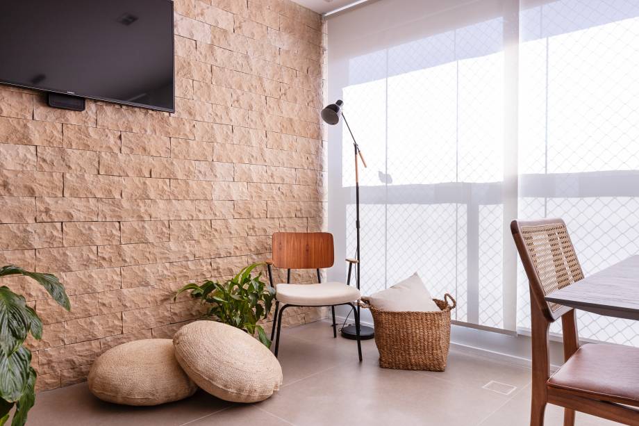 Para atender aos desejos do casal, o caixilho que dividia a sala foi substituído por brises de madeira. Também investiram em uma parede de brick, tons sóbrios e materiais naturais como madeira, cimento queimado, pedra, palhinha e couro – que garantem conforto visual para o projeto.
