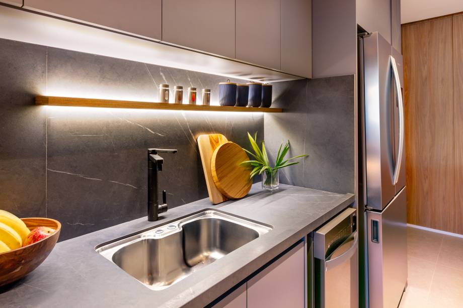 “Apaixonados pela praia, o projeto foi inspirado nessa temática. Eles queriam que o apartamento na cidade fosse uma combinação sutil entre conceitos urbanos e litorâneos”, explicam os arquitetos responsáveis.