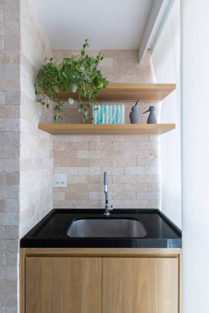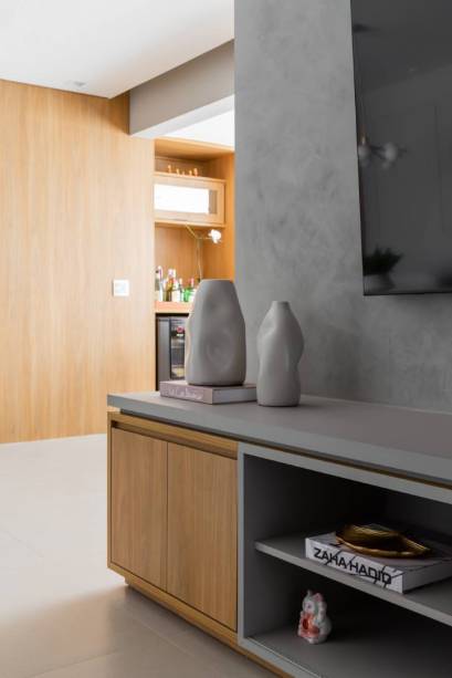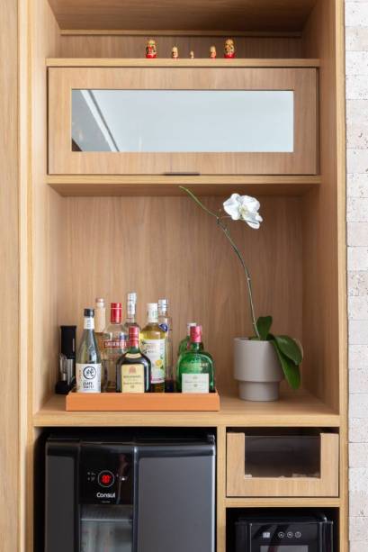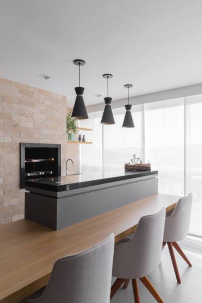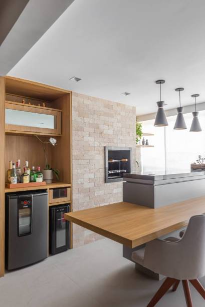 “Um dos principais destaques do projeto é a área da varanda com tijolos rústicos”, comenta a arquiteta. A churrasqueira ganha a companhia de um nicho que abriga a adega e o bar.