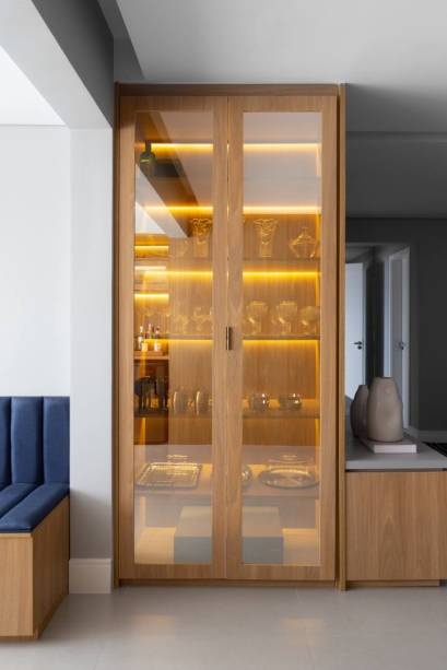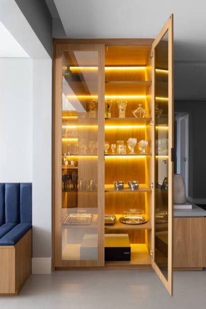 A cristaleira com iluminação embutida destaca as louças, criando um clima agradável e valorizando a marcenaria.