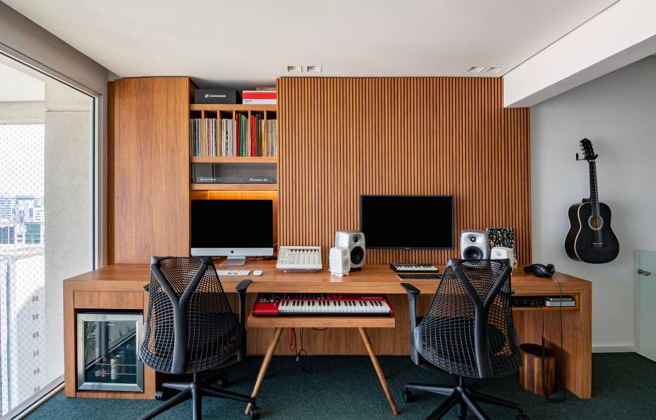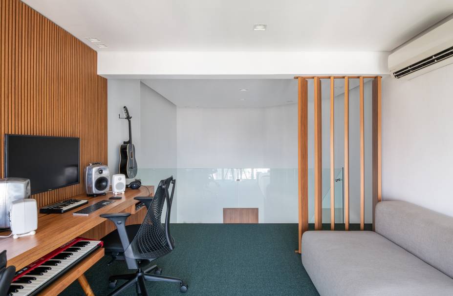 Inclusive, como a moradora é DJ, um estúdio foi montado no mezanino, onde tons de verde aparecem até no carpete escolhido para o conforto acústico. O brise permite mais privacidade, sem a necessidade de fechar totalmente o ambiente e a marcenaria foi feita sob medida para acomodar todos os aparelhos.