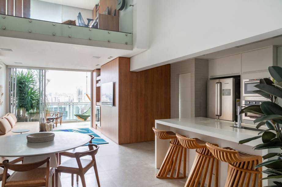 Utilizando como base a paleta neutra com tonalidades de branco, cinza, laranja e verde, a profissional explora a madeira natural em todo o projeto – o material reveste as paredes, a porta de entrada e o painel divisório articulado do mezanino.
