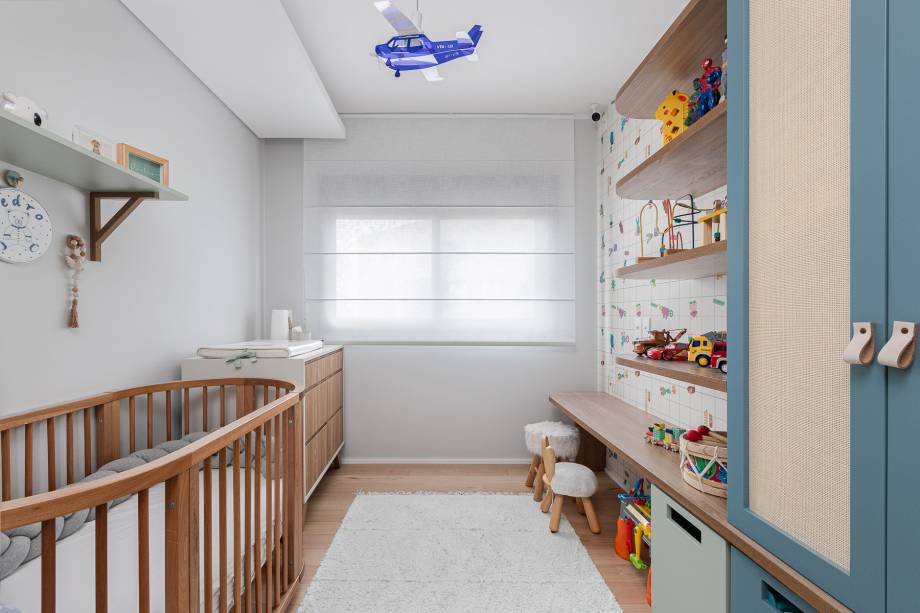 O filho mais velho ganhou um quarto desenhado para crescer junto com ele. O espaço conta com um mezanino que amplia a área de brincadeiras e uma marcenaria que combina tons de madeira e laca azul.