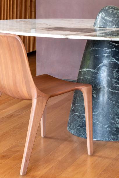 A curadoria de mobiliário e objetos foi realizada em colaboração com o cliente, priorizando peças de designers brasileiros. Entre os itens, destacam-se mesas de centro em mármore e aço, projetadas exclusivamente pelo VAGA Arquitetura para este projeto.