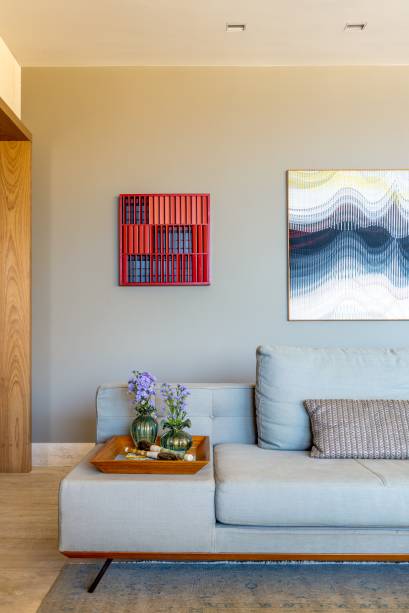 As cores dos estofados são suaves para que os quadros e os objetos sejam o foco da decoração – exceção feita para as poltronas vermelhas, design clássico de Ricardo Fasanello. Os móveis de design brasileiro foram uma escolha acertada para o apartamento, que tem também peças de Zalszupin e Sergio Rodrigues.