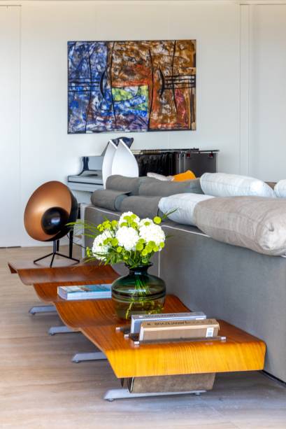 “Quando ela está aberta, pode-se ver o mar do corredor“, explica Andrea. “Eu não acho bonito uma sala cheia de portas e sempre procuro disfarçá-las. Procuro valorizar o mais que posso as obras de arte e não detalhes de arquitetura”, complementa.