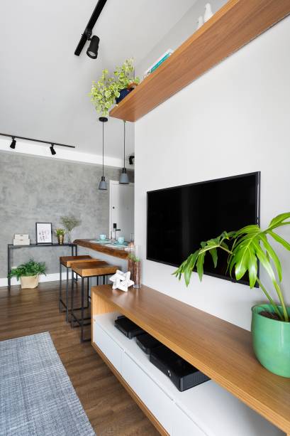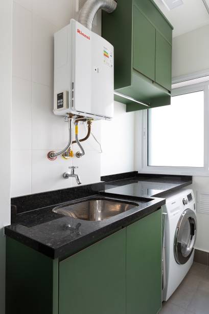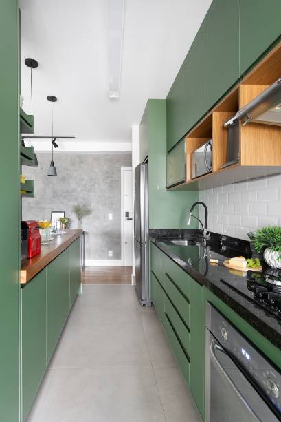 Além da cozinha verde, os ocupantes queriam um local prático e fácil de limpar, já que têm um cachorrinho, e também uma varanda versátil para receber convidados. Para dar uma sensação de amplitude, estar e cozinha foram integrados. Toda a marcenaria foi planejada, o que ajudou a aproveitar realmente cada centímetro quadrado da metragem.