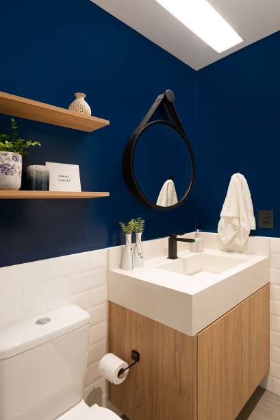 Outro destaque do projeto é o lavabo, também ousado na cor. A arquiteta sugeriu um tom forte de azul, que combinou bem com a madeira e o branco das louças. Veja mais na galeria abaixo!