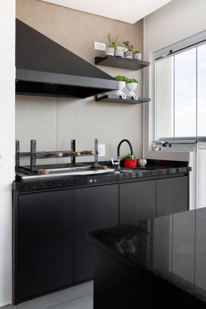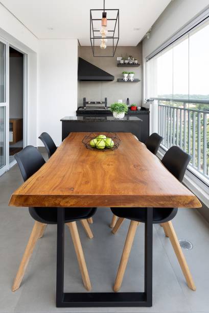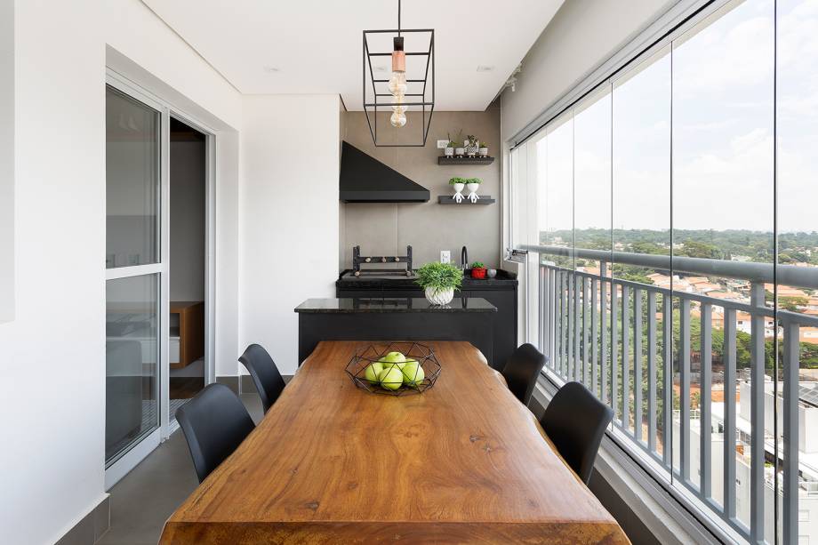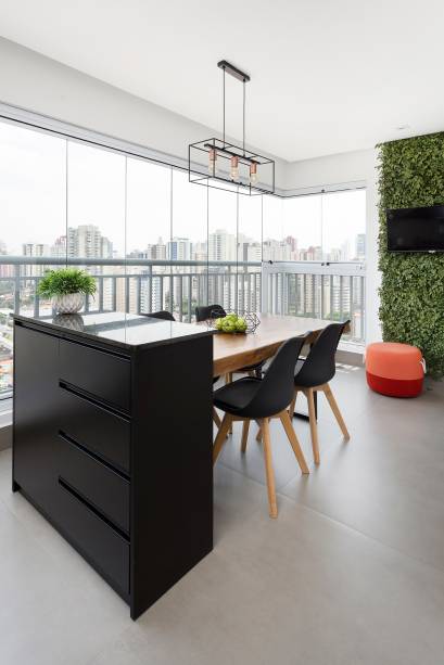 Na varanda, foi colocada uma ilha que é volante e um jardim vertical, deixando a atmosfera ideal para socializar e aproveitar a vista.