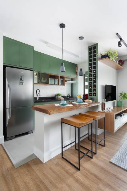 Uma cozinha verde, assim começa a história deste apartamento super estiloso de 60 m², em São Paulo. O casal de moradores veio com o pedido inusitado para a arquiteta Carolina Haddad, que topou o desafio.