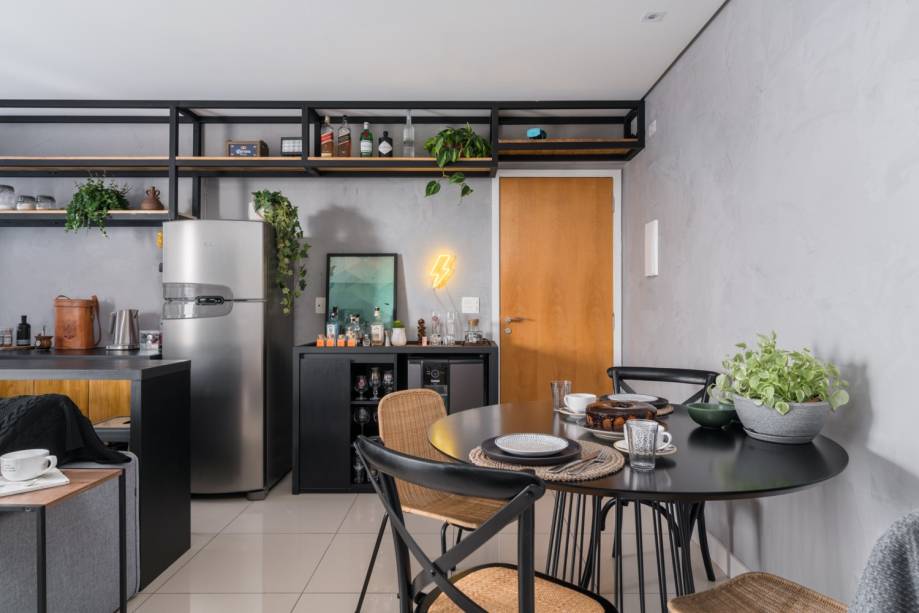 Os móveis de marcenaria, aliás, também marcam presença neste imóvel alugado. “Sugeri móveis mais leves e fáceis de tirar quando o cliente se mudar. Por isso, logo pensei em usar a marcenaria junto com a serralheria. Trabalhamos com a marcenaria de pínus e as estruturas de serralheria com pintura preta, ganhando destaque com uma iluminação de led de fora a fora”, conclui.