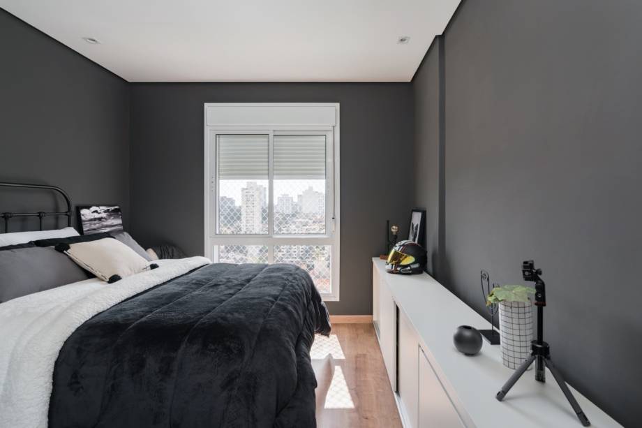 Uma das apostas da designer de interiores foi trabalhar com móveis soltos e as cores, principalmente nas paredes, com cinza, cimento queimado e branco. Além disso, foi fácil conseguir uma decoração personalizada porque o morador tem algumas paixões, como a fotografia, as motos e a vida agitada da capital paulista. “Só isso já transmite toda a energia necessária que o projeto precisa! Ele também queria um quarto bem imponente, uma paleta de cores mais sóbrias, mas ao mesmo tempo, aconchegante e estiloso”, conta.