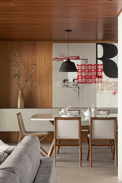 O forro de madeira em cumaru reforça a atmosfera de aconchego, aquecendo o ambiente e criando um contraste com o porcelanato cinza de toda a área social. Nos banheiros, há uma composição de revestimentos – a área do boxe e da bancada da pia receberam cerâmicas diversas e o ambiente ganhou em personalidade e cor.