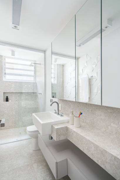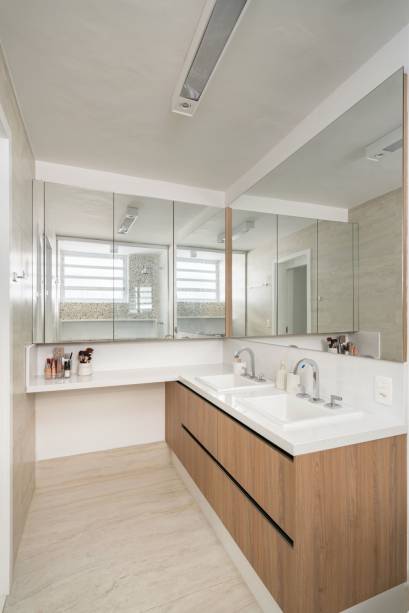 Em termos estruturais, o banheiro social foi ampliado e o de serviço foi transformado em um lavabo com entrada pelo home office. Um dos principais desafios na obra foi solucionar os problemas típicos de um apartamento antigo, como encanamento, esquadrias e claridade. “Como não tínhamos nenhuma planta estrutural, durante a obra fomos fazendo as investigações para confirmar onde seriam possíveis as intervenções propostas incialmente, como, por exemplo, a integração da cozinha com o living”, conta Jessica.