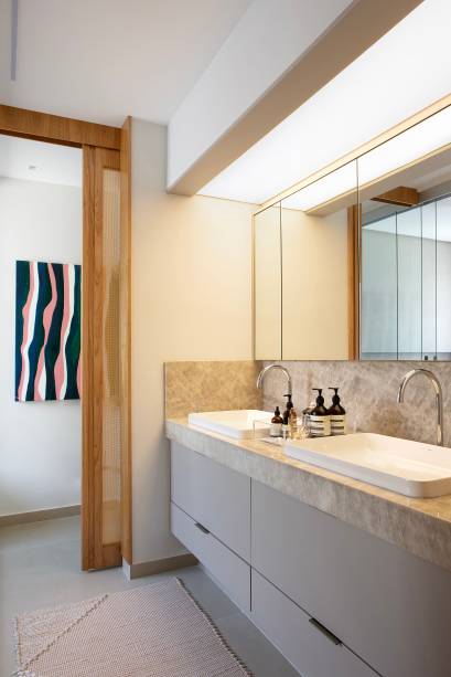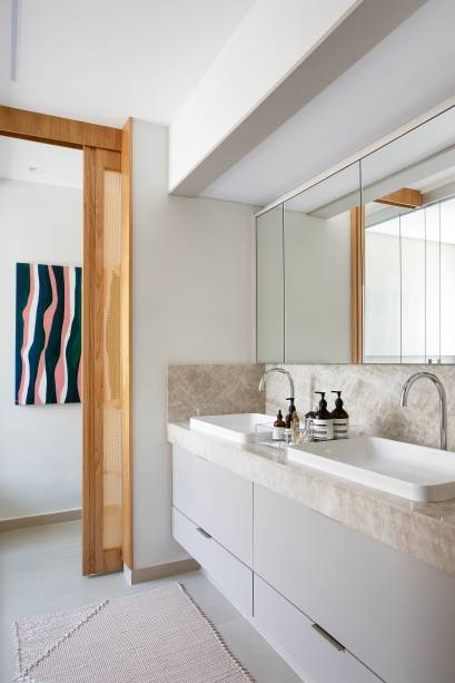 Na ala íntima do apartamento, o banheiro original foi dividido permitindo criar duas novas suítes, que futuramente podem receber os filhos do casal, além de um lavabo.