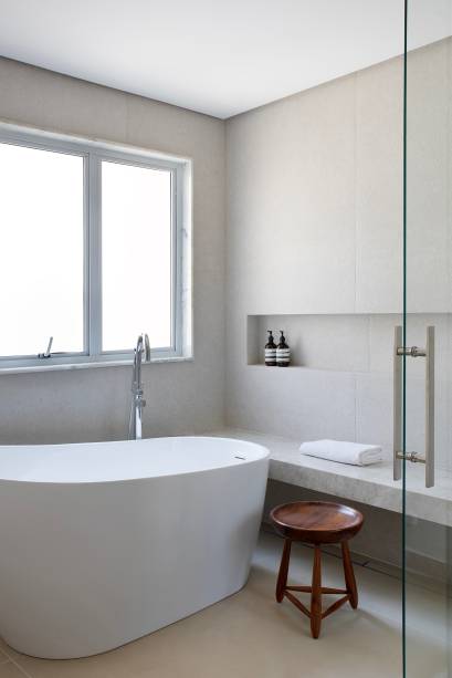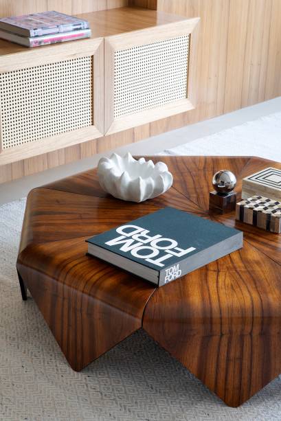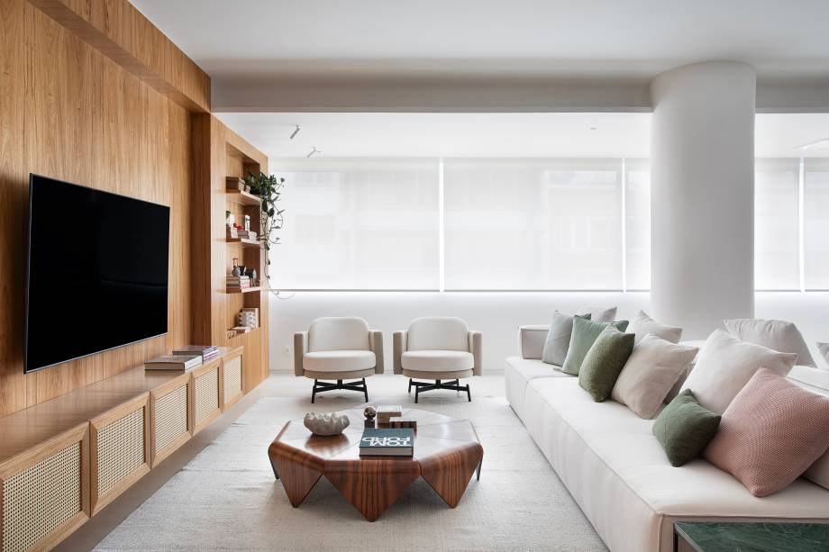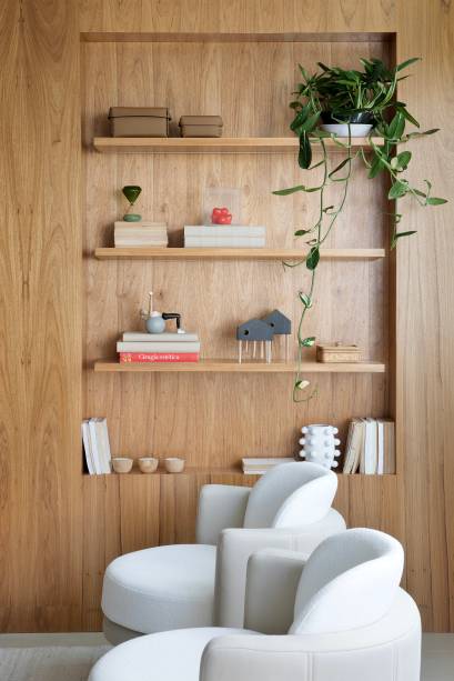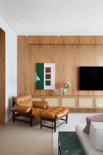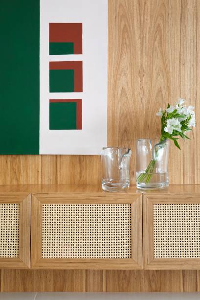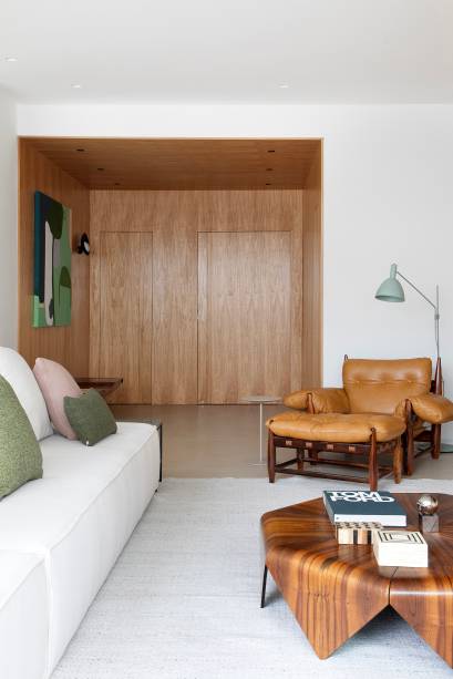 No design de interiores, os arquitetos mantiveram móveis de design também dos anos 1960 que já pertenciam ao casal, como a poltrona Mole, de Sérgio Rodrigues, e a mesa de centro Pétala, de Jorge Zalszupin. E optaram por uma paleta de cores neutras e suaves que deixam em destaque o grande painel em freijó do estar e do hall de entrada que foi todo revestido na madeira, criando uma entrada mais intimista.