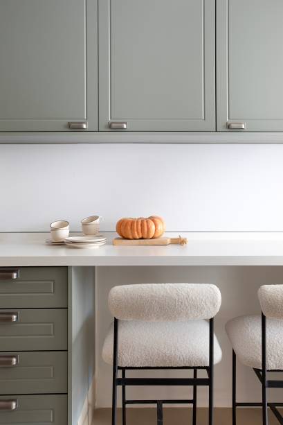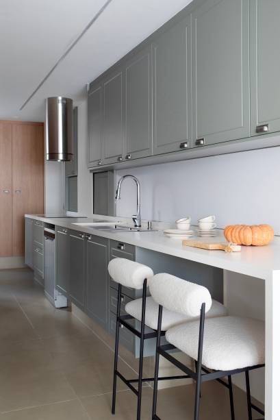“Para incluí-la, fizemos uma ilha bem ao lado da sala de jantar e criamos um pequeno espaço gourmet com grill, cervejeira e adega. Como o espaço fica ao lado da janela, instalamos ali uma coifa dutada para fazer a exaustão”, explica Bernardo.