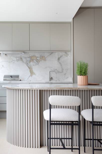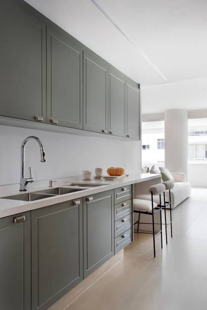 Bernardo Gaudie-Ley e Tânia Braida, da Beta Arquitetura, criaram uma pequena área gourmet adicionando uma ilha ao lado da sala de jantar.