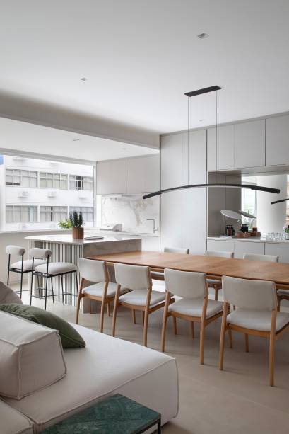 Para modernizar o layout e trazer funcionalidade ao dia a dia do casal, os arquitetos integraram a área social à cozinha, que ganhou mais espaço, mais iluminação natural e a possibilidade de ser fechada sempre que necessário por uma porta de correr. Outro pedido do casal, que adora cozinhar e receber os amigos, era ter uma churrasqueira na sala.
