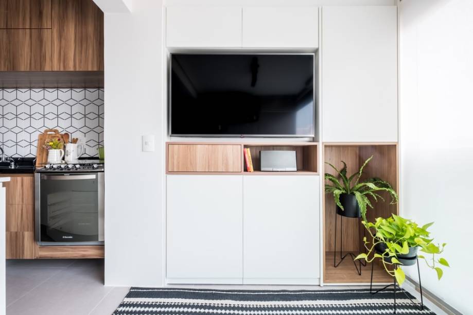 O grande trunfo deste projeto de apartamento pequeno, que ganhou um visual fluido e bem organizado, é a marcenaria. Tudo foi pensado com base na funcionalidade. Daí surgiu a ideia de criar uma ilha de apoio extra entre a cozinha e a sala de jantar. Na parte inferior, há mais armários e gavetas, além de um nicho lateral. Sobre esta ilha há, ainda, uma prateleira suspensa por uma estrutura de aço que serve também de apoio para utensílios de cozinha.