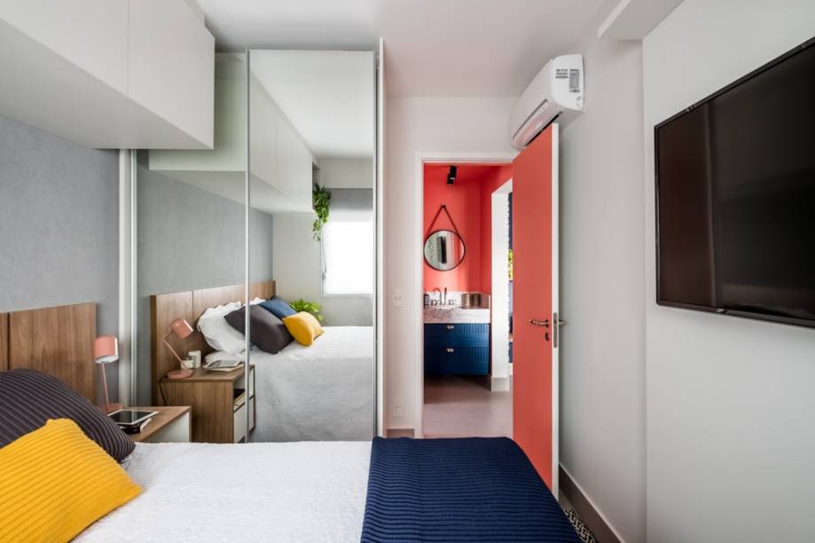 E, para arrematar o projeto com muita cor e um toque de ousadia, as arquitetas escolheram um tom coral no hall da área íntima.
