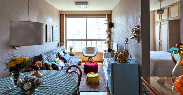 A designer de interiores Ingrid Hirsch se mudou para este apartamento de 40 m² onde morava sua avó e ficou com os móveis planejados. Para deixar o local com sua cara – e sem gastar muito -, Ingrid lançou mão de alternativas rápidas de reforma e aproveitamento de espaço: mesa redonda, tinta que imita concreto, reforma de móveis… O microondas foi parar na sala, assim como o frigobar. A cozinha ganhou adesivos de azulejos coloridos. E até as lembranças de viagem ganharam lugar de destaque na sala.